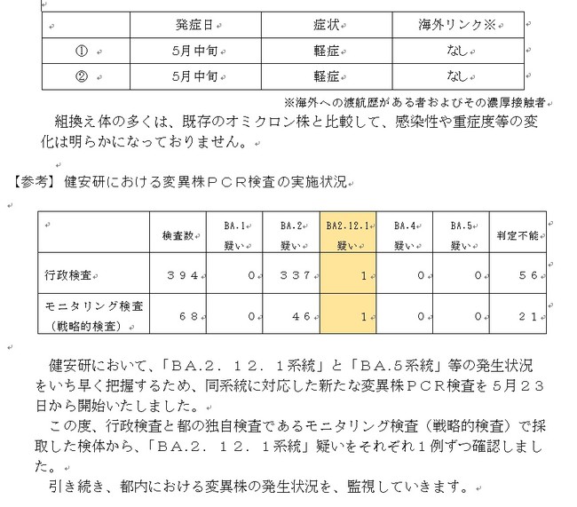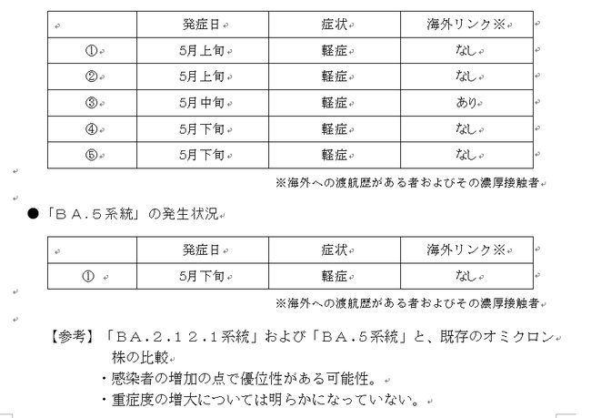 この度、健安研等においてゲノム解析を行った結果、新たに、オミクロン株の亜系統である「BA.2.12.1系統」を5例、「BA.5系統」を1例、「BA.1系統とBA.2系統の組換え体」を2例確認したため、下記のとおり、お知らせいたします。