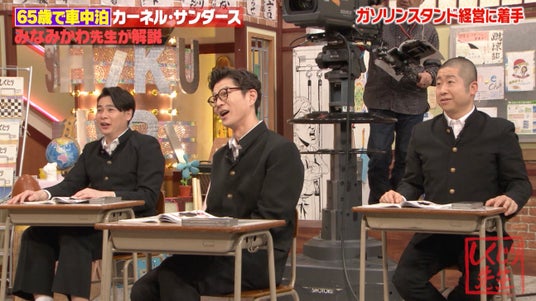 授業冒頭、みなみかわはカーネル・サンダースについて、「アメリカの食文化を変えた男」と紹介しつつ、KFCの創業年齢が65歳だったことを解説。一同から「ええ!?遅い!!」と驚きの声が上がる中、さらに65歳で創業した時は「無一文で車中泊生活だった」と明かし、教室は騒然となりました。加えて、みなみかわは「カーネル・サンダースの人生のしくじりを数えたところ、36個(3ダース)」と説明。人柄についても「頑固で短気!超諦めが悪い!」人物だったと紹介しました。