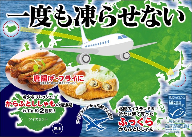 このたび、最もおいしいと言われる最漁期に漁獲された「からふとししゃも」をアイスランドから一度も凍らせずに空輸で仕入れて販売することで、その特長をより感じていただける状態でご提供します。