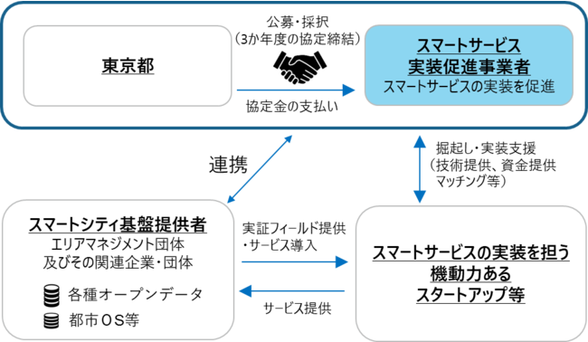 そこで、まず、東京都と連携し、スマートサービスの実装を行うスタートアップ等に対する支援を実施する「スマートサービス実装促進事業者」を以下のとおり公募します。