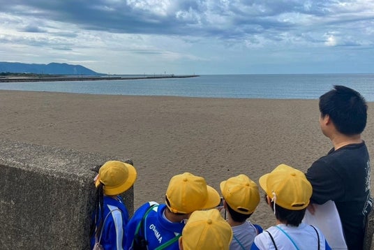 浜辺から三国港突堤と三国防波堤灯台を眺め、解説に耳を傾ける子どもたち