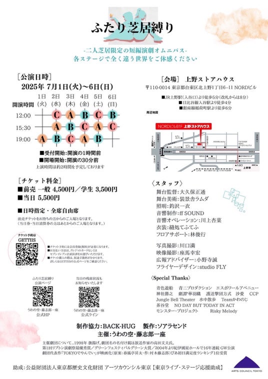 2025年7月1日(火)~6日(日)、上野ストアハウスにて、短編演劇オムニバス公演『ふたり芝居縛り』を上演します。本作では、登場人物は「2人のみ」という縛りのもと、1つひとつまったく異なる世界観を描き、観客を新たな物語の入り口へと誘います。