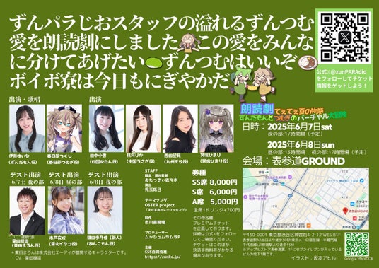 『朗読劇てぇてぇ夏の物語:ずんだもんとつむぎのバーチャル大冒険』が2025年6月7日 (土) ~ 2025年6月8日 (日)に表参道GROUND(東京都渋谷区神宮前4丁目2-12 WES B1F)にて開催されます。