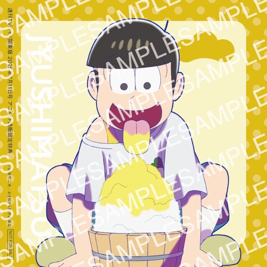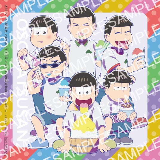 「週刊TVガイド7月11日号」(7月2日発売)では、7月8日より第4期がスタートするTVアニメ『おそ松さん』とのスペシャルコラボを実施。描きおろしイラストによるバックカバーのほか、アニメイト通販特典として、関東版を購入するとオリジナルスクエア判ブロマイド(89mm×89mm)が7種ランダムでプレゼントされる。思い思いに夏を満喫する6人のブロマイドを、ぜひこの機会に入手していただきたい。