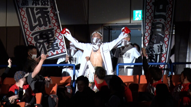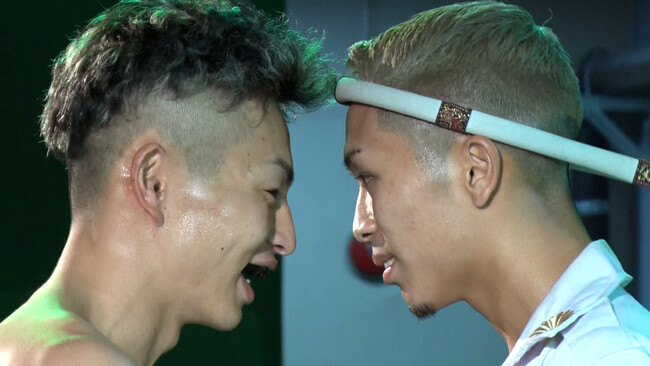 最も会場を沸かせたバンタム級王座決定戦では、試合前の会見で乱闘騒ぎになった´この男、凶暴につき´の異名を持つ、東京出身 嵐選手(バンタム級3位)が特攻服に身を包みド派手に登場!迎え撃つのは大阪出身´左の殺し屋´甲斐元太郎選手(バンタム級2位)。嵐の初載冠か?甲斐の王座返り咲きか?