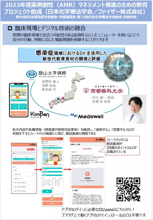 同プロジェクトでは岡山大学病院薬剤部の木村郁哉薬剤師が起業した岡山大学発ベンチャー・株式会社Medswellが開発した薬剤師向け教育アプリ「KimBen pharma(キンベン ファーマ)」を教育に活用。同アプリは臨床現場を再現したシミュレーション形式で、全国の感染症専門薬剤師が作成した模擬症例を体験できるほか、作問者による解説動画や基礎的な知識を学べる動画コンテンツも提供されています。