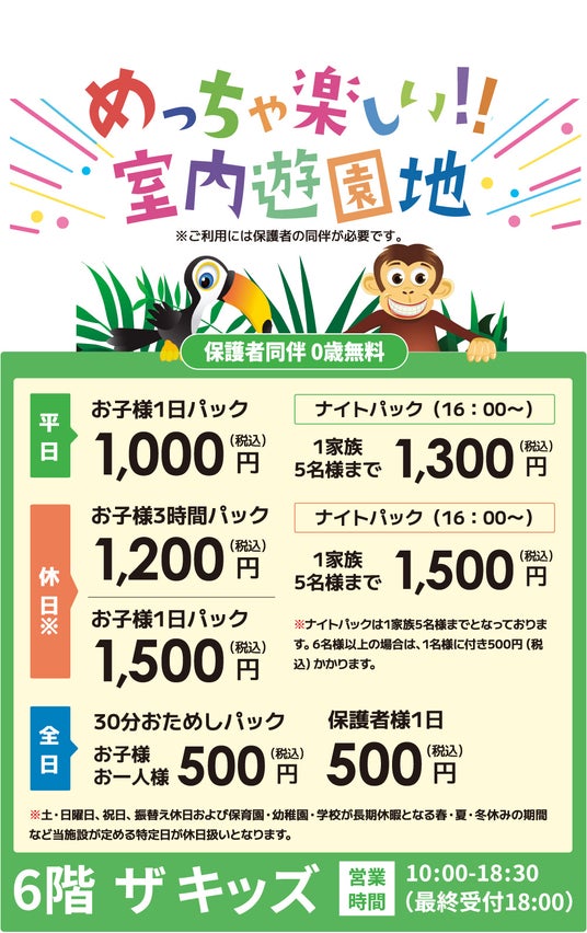 幼児から小学生の子供が遊べる室内遊び場がオープンします。巨大ジャングルジムはじめ、ボールプールやすべり台、乗り物遊具など身体を動かして遊べる遊具がいっぱい。