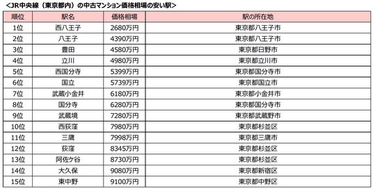 株式会社リクルート(本社:東京都千代田区、代表取締役社長:牛田圭一、以下リクルート)が運営するニュースサイト『SUUMOジャーナル(スーモジャーナル)』は、住まいや暮らしに関するさまざまなテーマについて調査を実施し、結果をご紹介しています。今回は、JR中央線のうち東京都内に位置する、東京駅から高尾駅の全32駅を対象に専有面積50平米以上~80平米未満のカップル・ファミリー向け物件の、価格相場が安い駅ランキング上位15駅をご紹介します。1位は西八王子駅で価格相場は2680万円でした。ランキングのなかから注目の駅も併せて紹介します。ランキングの詳細は『SUUMOジャーナル』でご覧いただけます。