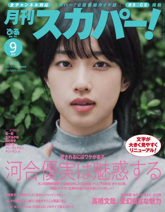 新作映画「ナミビアの砂漠」に出演する河合優実が表紙に登場!A4ワイド版にリニューアルした「月刊スカパー!」2024年9月号が8月26日(月)に発売!