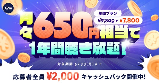 AWA株式会社(本社:東京都港区、代表取締役CEO:冨樫晃己)が運営する、サブスクリプション型(定額制)音楽ストリーミングサービス「AWA(アワ)」は、2025年6月11日(水)より、AWA STANDARD会員の年間プランをご登録いただいた方を対象に、第4弾¥2,000キャッシュバックキャンペーンを開催いたします。