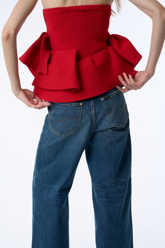 “101-J“をベースに大胆にカットしたビスチェは、LeeRIDERSと刻印されたボタンとLee ロゴのネームはそのままに、スカートにもアレンジできる2WAY仕様。バックサイドのボタンでサイズを調整できるのも魅力です。
