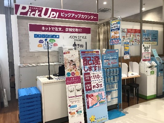 スマホやパソコンから注文した商品を店舗から自宅にお届けする「おうちでイオン イオンネットスーパー」では、生鮮食品や冷凍食品、総菜などの食品から、トイレットペーパーなどの日用品まで品揃えします。また、注文した商品を店頭にて受け取れる「ピックアップ!」では、店内の専用カウンターで受け取りができる「カウンターピックアップ!」を導入しています。