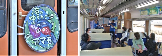 アマモ仕様になった列車に乗り込み、クイズ形式で浜名湖の異変を学ぶ!