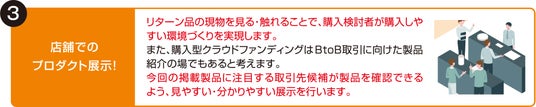 公社が実施している中小企業向けの販路開拓支援、即ち「中小企業ニューマーケット開拓支援事業」の支援製品を対象とし、その中から選出された製品・企業に対し、近年新たな販路開拓支援ツールとして注目を集める購入型クラウドファンディングを経験する機会を積極提供するというものです。特にアドバイザーによるオーダーメイドの支援が好評を博し、掲載者にとって満足度の高い支援です。