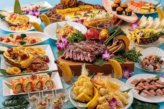 「パイナップルとナッツのサラダ」や、パインのソテーを添えた「ポークハワイアンとオニオンリング」、「マンゴー風味の海老マヨネーズ」やココナッツ香るカレー・パスタなど、フルーツを感じるお料理を存分にお楽しみいただけます。さらに、天ぷらコーナーでは、揚げたての「バナナ天ぷら」や「パイナップル天ぷら」をご用意しました。