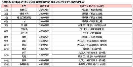 株式会社リクルート(本社:東京都千代田区、代表取締役社長:牛田圭一、以下リクルート)が運営するニュースサイト『SUUMOジャーナル(スーモジャーナル)』は、住まいや暮らしに関するさまざまなテーマについて調査を実施し、結果をご紹介しています。都内の不動産価格は上昇の一途をたどっており、「新築マンションなら1億円超は当たり前」なんて声も聞こえてきます。中古マンションも例外ではないのですが、それでも仕事や生活、交通網といった環境のよさを考えると、「やっぱり23区内に住みたい!」と考える人も少なくありません。そんな人の参考になるように、東京23区内に位置する駅から徒歩15分圏内にある、シングル向け(専有面積20平米以上~50平米未満)とカップル・ファミリー向け(専有面積50平米以上~80平米未満)、それぞれの中古マンション平均価格が安い駅のランキングを紹介します。シングル向け1位は西馬込駅、カップル・ファミリー向け1位は柴又駅でした。ランキングの詳細は『SUUMOジャーナル』でご覧いただけます。