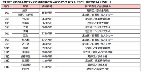 続いてカップル・ファミリー向け中古マンション(専有面積50平米以上~80平米未満)のランキングを紹介します。1位には価格相場が3580万円と同額だった、京成金町線・柴又駅と、日暮里・舎人ライナーの西新井大師西駅の2駅がランクインしました。