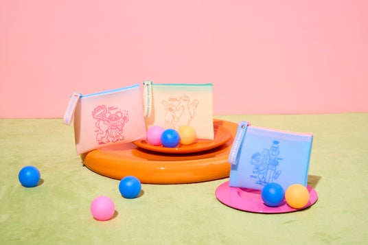 小物やお菓子などの収納にもぴったりなサイズ感のPVCポーチは、ファスナーのスライダー部分と持ち手のエレメント部分の対照的な色の組み合わせと大きくプリントされたキャラクターの線画が特徴的です。