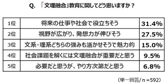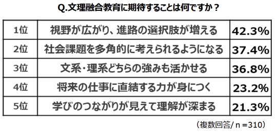 保護者に対し、文系・理系のどちらの要素も併せ持ち横断的に学んでいく“文理融合教育”について聞きました。まず、イメージについては、1位「文系・理系どちらの強みも活かせそうで魅力的」、2位「視野が広がり、発想力が伸びそう」、3位「将来の仕事や社会で役立ちそう」と、いずれもポジティブな項目が上位に挙がりました。また、期待することを聞くと、1位「視野が広がり、進路の選択肢が増える」、2位「社会課題を多角的に考えられるようになる」、3位「文系・理系どちらの強みも活かせる」という結果に。ピンポイントのスキル装着などではなく、どちらの良さも取り入れながら視野を広げることを総じて期待しているようです。