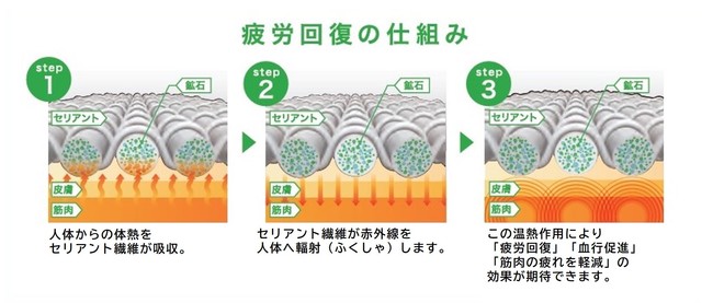 「トップバリュ セレクト セリアント」は、アメリカのホロジェニックス(HOLOGENIX)社が開発した、数種類の微細な鉱石を練りこんだ特殊な素材「CELLIANT(R)」※4)(セリアント)を日本で初めて使用しており、国内プライベートブランドとして初めて、一般医療機器として届出された疲労回復ウェアです。着用することで、以下の効果が期待できます。※3)(洗濯後も同様の効果が期待できます。)