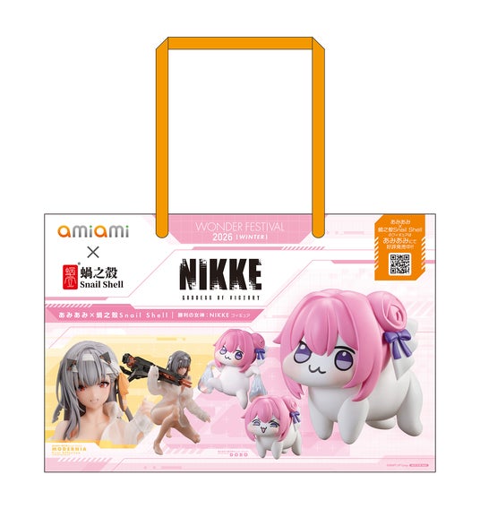 2.ブースにて『特製あみあみバッグ -WF2026冬-』を配布。藤ちょこ先生による「あみこ」イラスト面と、あみあみ×蝸之殼Snail Shell「勝利の女神:NIKKE」フィギュア画像の2種類がデザインされたスペシャルデザインショッパーです。