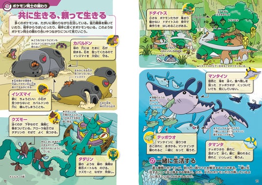 協力関係、相手をだます戦略、なわばり争い、群れなど、ポケモン同士の関わり合いを解説。人との共存についても注目していきます。