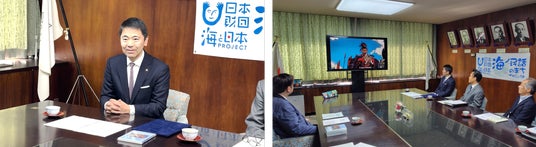一般社団法人日本昔ばなし協会の沼田心之介代表理事より、松尾崇市長へ海ノ民話のまち認定証を贈呈。その後、沼田友之介アニメ制作プロデューサーより完成アニメDVDパッケージを贈りました。アニメーションは今後、図書館や観光協会等での活用を予定しています。