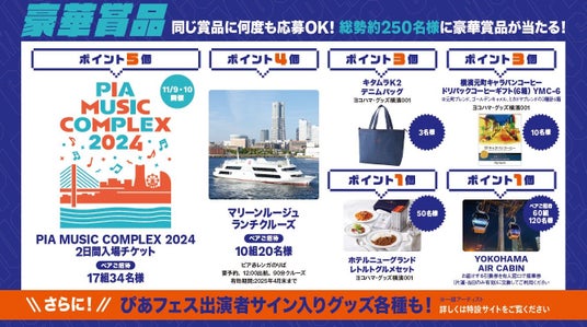 スタンプを貯めて応募できる賞品は、ぴあフェスの2日間入場チケットや、マリーンルージュのランチクルーズ、横浜関連のグッズやグルメ賞品などバラエティ豊富。