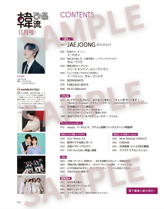 2024年11月号は、多くのK-POPアーティストに影響を与え、世界中のファンの心をつかんで離さないアーティストJAEJOONG(ジェジュン)がついに初表紙&巻頭に登場。デビュー20周年を迎えたJAEJOONGは、6月に自身の事務所の日本法人であるiNKODE JAPANの設立を発表。20周年記念フルアルバム『FLOWER GARDEN』も発売し、8月にはアジアツアーの日本公演も大成功に収めました。