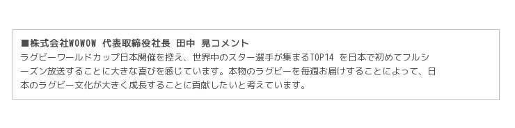 株式会社WOWOW(本社:東京都港区、代表取締役社長:田中晃、以下、WOWOW)は、ラグビー界最大の観客動員数と収益を誇るフランスのプロリーグ「TOP14」(トップフォーティーン)を、2016-17シーズンより放送することを決定しました。同リーグをフルシーズン放送するのは日本初となります。