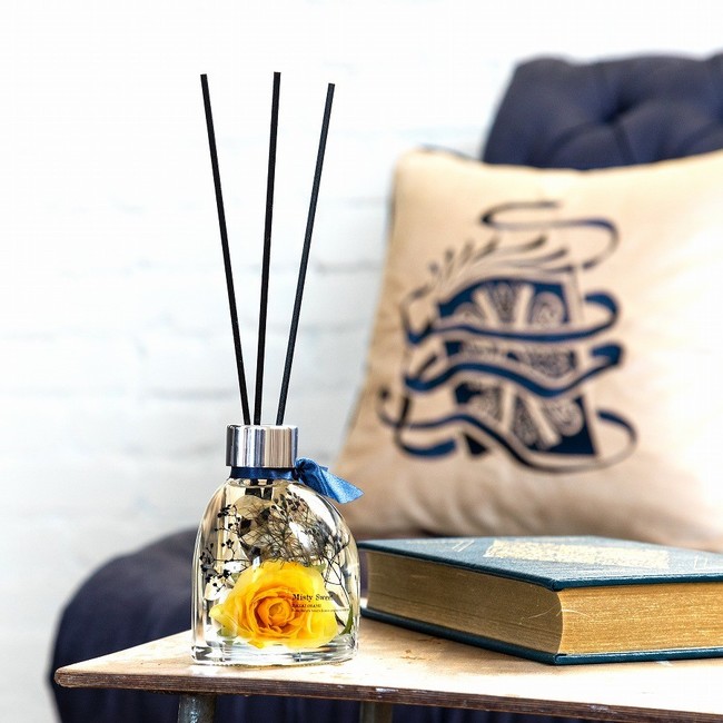 ミステリアスでどこか影のある、太宰治を表現したアロマリウム。重厚で暗いトーンのジャスミンに太宰をイメージしたお香のように香るスモーキーなアンバーで仕上げました。ボトルの中の黄色いバラがポイント。お部屋の一角に飾ればラグジュアリーな空間に!