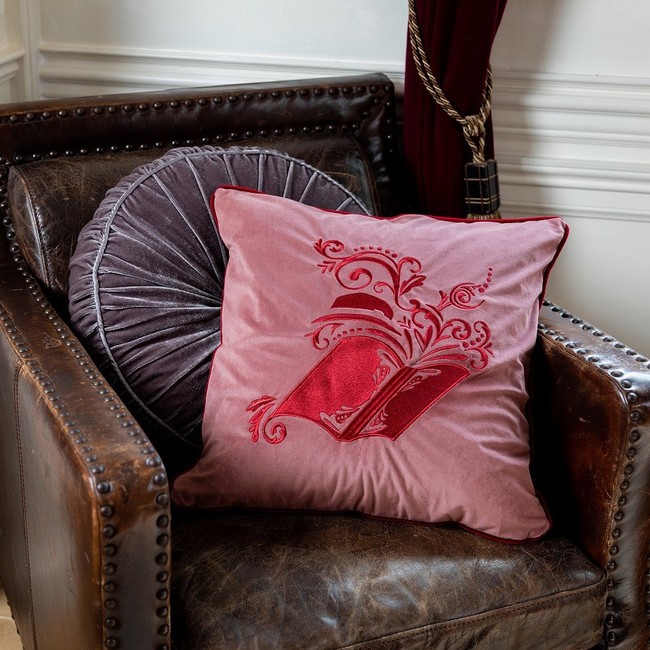 異能力「汚れつちまつた悲しみに」、「帽子」、「ワイン」等をイメージした刺繍をあしらったクッションカバー。ほど良い起毛感と微光沢な素材感が、お部屋をプチグレードアップしてくれます。裏側の織ネームもポイントです。