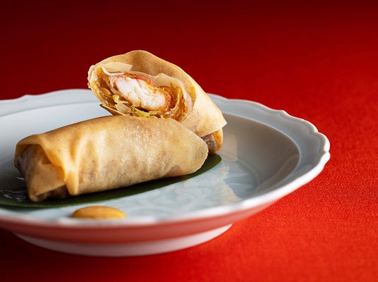 ランチコースの「フカヒレとタラバ蟹卵の煮込み ~フォアグラのフランとのマリアージュ~」は、とろとろの食感と芳醇な香りをご堪能いただける逸品。昨年登場し好評だったため、今年もご用意いたします。ディナーコースでは「タラバ蟹の春巻」が登場。パリッとした春巻きの皮の食感とともに、ピリ辛に味付けしたタラバ蟹の贅沢な風味をご堪能いただけます。