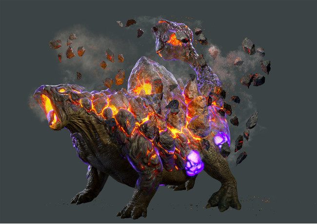 背中の甲殻や尻尾から発射する砲撃は、着弾地点で爆発し、周囲を巻き込む。