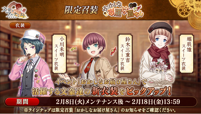 文豪の「衣装」や、会派に装備する事で能力を強化できる「装像」などが入手できるコンテンツ「召装」に、限定召装「おかしなお届け屋さん」が期間限定で登場します。この召装では、イベント『調査任務「おかしなお届け屋さん」』で活躍する「小川未明」「鈴木三重吉」「堀辰雄」の新衣装を一定の確率で入手できます。