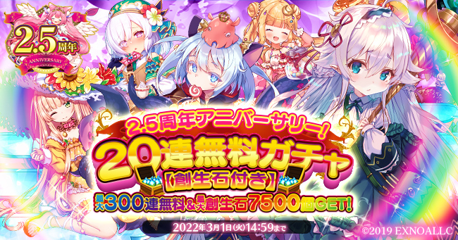 2.5周年アニバーサリー開催を記念して、「【創生石付き】アニバーサリー20連無料ガチャ」を開催しております。本ガチャは期間中、最大300連無料で引くことができます。さらに10連1回引くごとに創生石250個がついてくる!期間中最大で創生石7500個GET!?過去のアニバーサリーキャラも当選する豪華なガチャとなっておりますので、是非、この機会に2.5周年アニバーサリーをお楽しみください♪