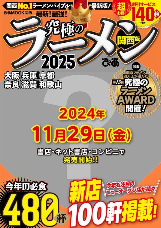 「究極のラーメン 関西版」(ぴあ)が今年も11月末に発売されることが決定した。近年、さらなる進化が止まらない関西のラーメンシーンにおいては、毎年秋に注目の新店が最もオープンするタイミングとなっており、これらの最新のニューオープン情報もバッチリ掲載することで、「関西エリアNo.1ラーメン情報誌」がさらにパワーアップ! そして毎年、ラーメンマニアから注目を集める、関西ラーメン界最高権威「究極のラーメンAWARD関西」も併せて発表される。現在、"関西ラーメン四天王"と呼ばれる有名ラーメン通4名が、1000店以上ものノミネート店の中から「いま食べるべき一杯」を絶賛選考中。この関西ラーメンマニアの必須バイブル本を手に、2024年の関西ラーメンシーンを総括しつつ、新たな2025年に訪れるべきお店を先取りしよう!
