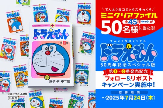 てんとう虫コミックス『ドラえもん』50周年記念スペシャルシリーズ第1巻~第6巻の発売を記念し、2024年夏に実施した50周年記念書店フェアでご好評をいただいたノベルティ「てんとう虫コミックスそっくりミニクリアファイル」全45種セットが当たるXキャンペーンもスタート!