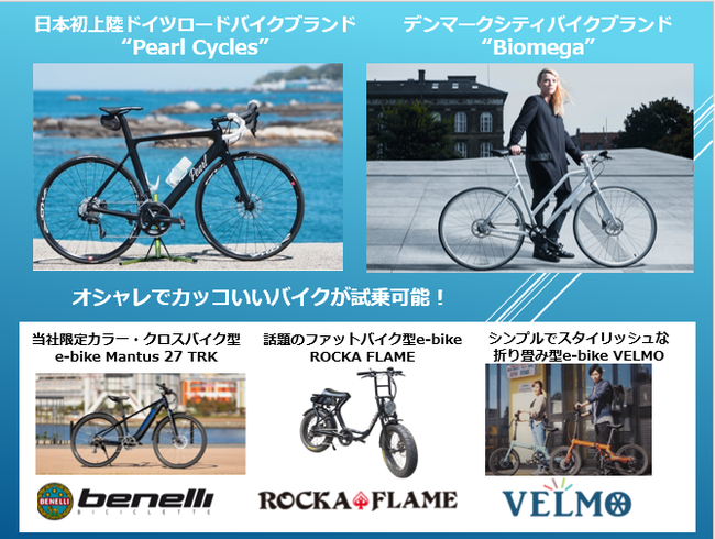ECサイトにて販売中のE-BIKEや日本初上陸の海外ブランドの自転車を実際に試乗して購入することが可能です。雨天でも、展示会形式で行うため触れる機会も十分にあります。みなさまのご来場心待ちにしております。
