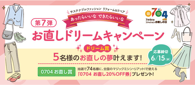 7月4日が「ファッションお直しの日」(一般社団法人日本記念日協会認定)に制定された記念に、当社「マジックミシン」「リアット!」が持つお直しの技術を通じて、お気に入りのものを生まれ変わらせたい、大切にされていたものをリメイクして思いに寄り添いたいなどの、お客さまのファッションに関する夢を叶えるお手伝いをさせていただくキャンペーンです。