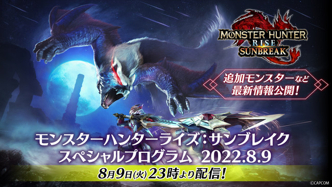 好評発売中『モンスターハンターライズ:サンブレイク』の最新情報をお届けする映像番組「モンスターハンターライズ:サンブレイク スペシャルプログラム 2022.8.9」の配信が決定致しました。2022年8月9日(火)23時より配信いたします。