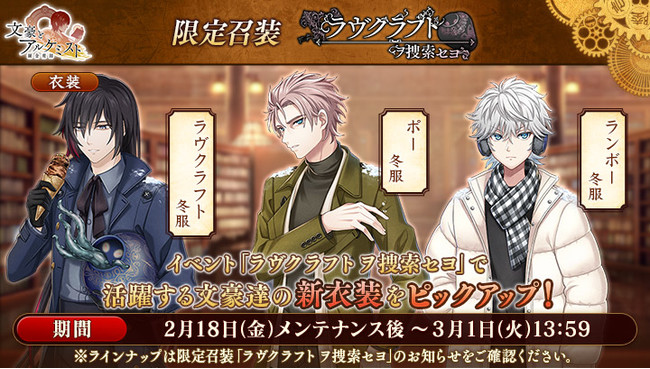 合同会社EXNOA(本社:東京都港区、CEO:村中 悠介、URL:https://games.dmm.com/)が運営するDMM GAMESは、2月18日(金)より、女性向け文豪転生シミュレーションゲーム「文豪とアルケミスト」において、イベント『調査任務「ラヴクラフト ヲ捜索セヨ」』と限定召装「ラヴクラフト ヲ捜索セヨ」を開催いたしました。