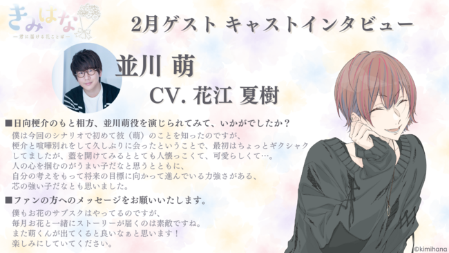 株式会社ムービックは、毎月ご自宅にオリジナル音声ドラマとミニブーケをお届けする新しいサブスクリプションサービス【きみはな~君に届ける花ことば~】のサブスク2月分音声ドラマに登場するゲストキャラクター及び声優キャストが決定!