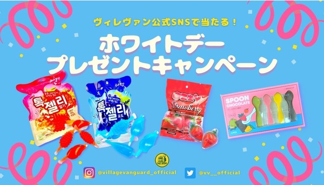 株式会社ヴィレッジヴァンガードコーポレーション(所在地:愛知県名古屋市、代表取締役社長:白川篤典)では、2022年3月10日(木)より公式SNSにおいて、『ホワイトデープレゼントキャンペーン』を開始いたしました。