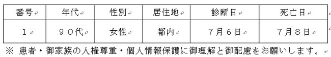2022-07-13 東京都 新型コロナウイルスに関連した患者の死亡について Tweet ~新型コロナウイルスに関連した東京都からのお知らせ~ 都内で新型コロナウイルスに感染した方が死亡されましたのでお知らせします。 お亡くなりになった方のご冥福をお祈り申し上げます。 企業プレスリリース詳細へ PR TIMESトップへ 公式ツイッター Follow @Straightpress 最新情報をTwitterで受け取ろう! 公式フェイスブックページ 最新情報をFacebookで受け取ろう! 前の記事 一覧へ戻る 次の記事