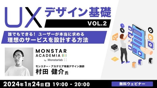 株式会社クリーク・アンド・リバー社(C&R社)は1月24日(水)、Webデザイナーの方やUXデザインについて学びたい方やUXデザイナーを目指している方などを対象に、無料のオンラインセミナー「UXデザイン基礎Vol.2 誰でもできる!ユーザーが本当に求める理想のサービスを設計する方法」を開催します。なお本セミナーは、モンスター・アカデミアとの共催となります。▼詳細・お申し込みはこちら