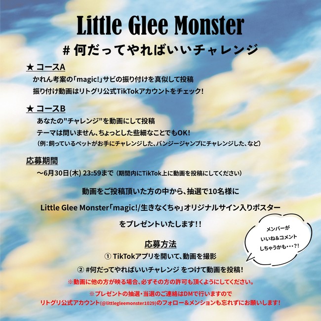 TikTok上に振付動画をアップするか、日常のちょっとした “チャレンジ”を投稿するとメンバーからのコメントやサイン入りポスターが当たる企画となっている。