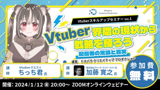 株式会社クリーク・アンド・リバー社(C&R社)の事業プロデューサー加藤寛之は、1月12日(金)に開催される、株式会社サードウェーブが展開するコンピューターショップ ドスパラ主催の「VTuberスキルアップセミナーVol.1 VTuber 界隈の現状から戦略を練ろう 配信者の常識と真実」オンラインセミナーに講師として登壇します。▼参加申し込み
