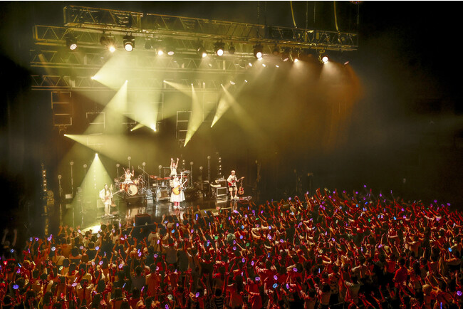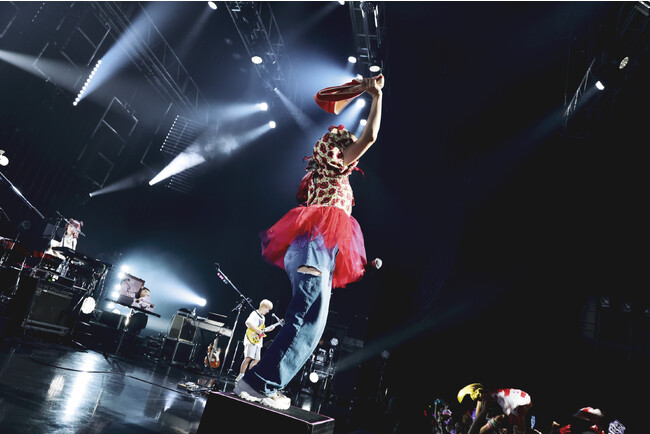 “ここからはみんなでいっぱい歌ってワイワイするコーナーなんですけど、元気余ってますか?”という呼びかけから、「死ぬこと以外かすり傷」でヒートアップ。タオルを回したり手を上げたり大合唱したりと、観客は思いのままに楽しむ。さらに“みんなまだまだ行ける? この街が大好き!トーキョー!”と煽りインディーズ時代の楽曲「トーキョー」で畳み掛け、アッパーチューン「SPARK!!」で盛り上がりは最高潮に。「真っ赤な爪と牛乳」では、観客のペンライトでフロアが赤く染まった。