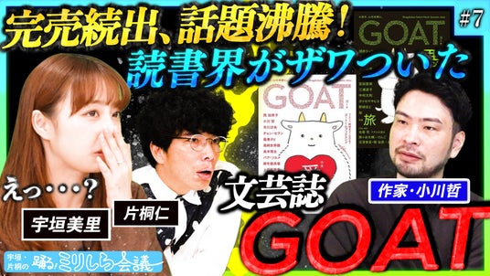 「宇垣・片桐の踊る!ミリしら会議」は、1mmも知らない、通称「ミリしら」をテーマに、 『ミリしら』な視聴者の方に向けて宇垣美里氏・片桐仁氏がゲストとともに本や商品の魅力を明らかにするyoutube番組です。このたび作家・小川哲氏と「GOAT」担当編集者が出演しました。読者の心を弄ぶかのような小川さんの「GOAT」掲載作について創作舞台裏や、「GOAT」好調の理由や値段の謎について、MCの二人が切り込みました。
